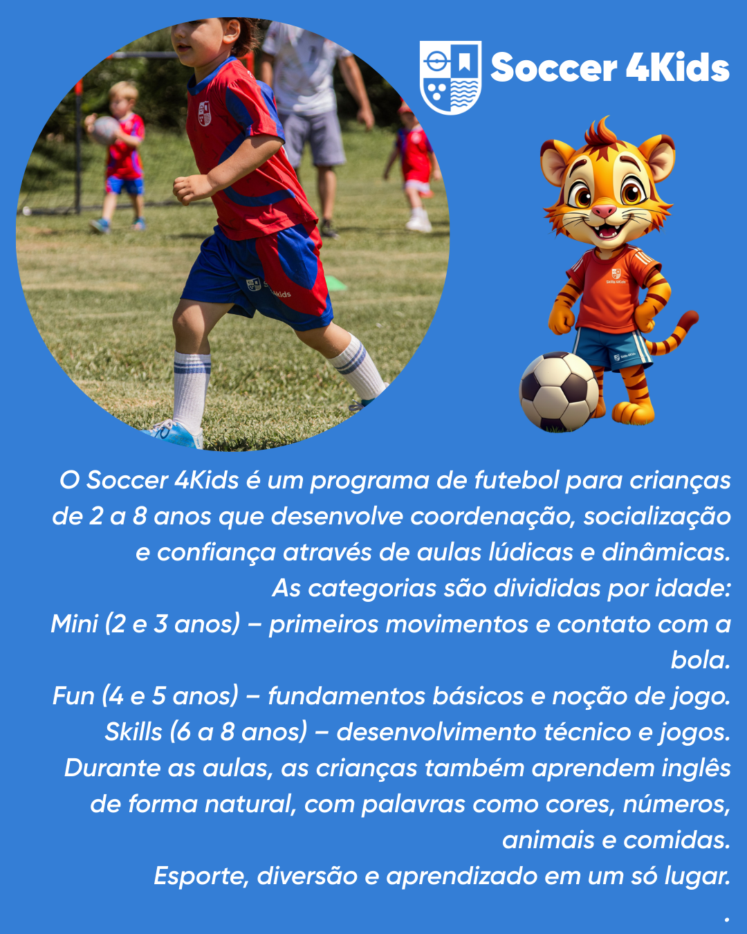 A Skills 4Kids é uma escola de formação esportiva infantil que desenvolve crianças mais **ativas, confiantes e felizes** por meio do esporte.