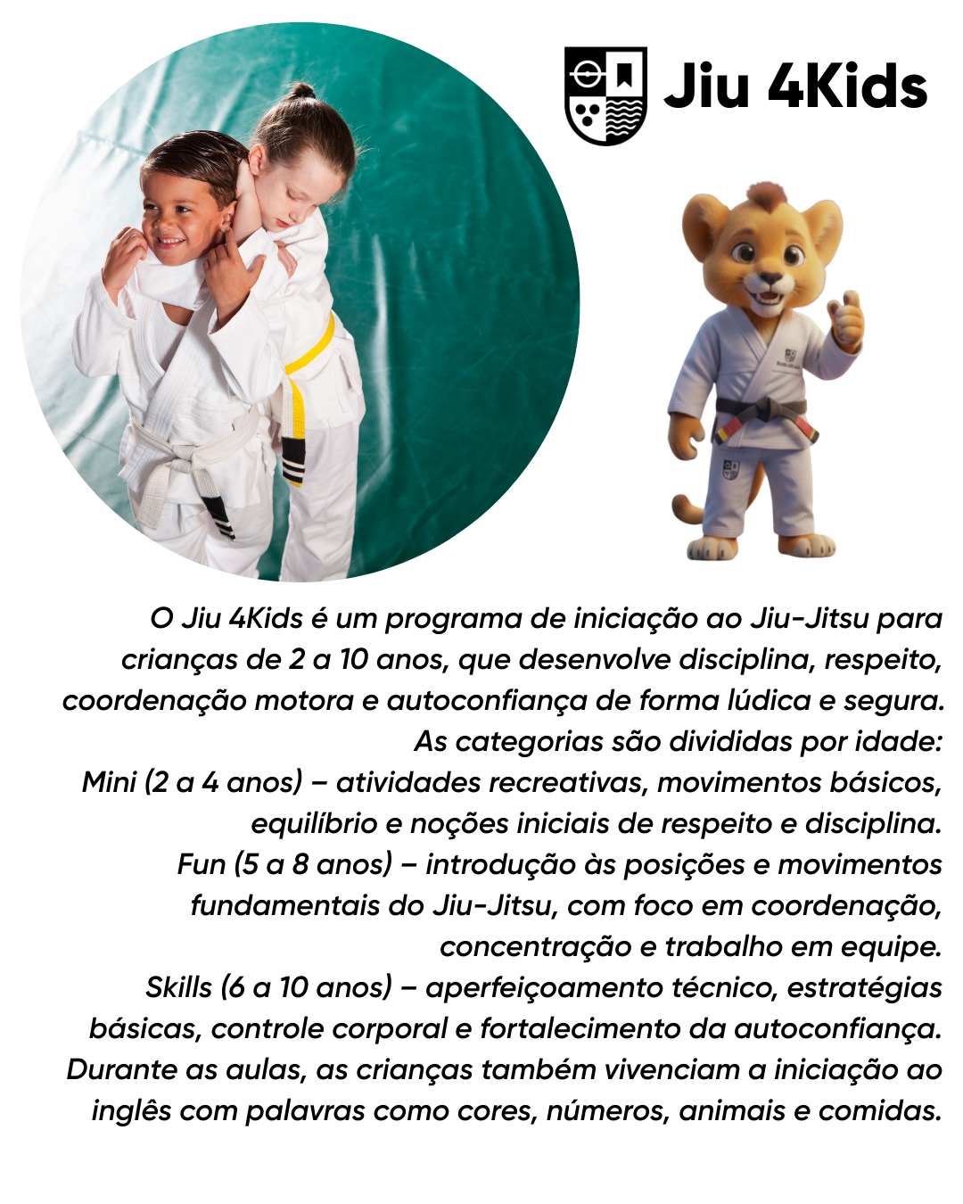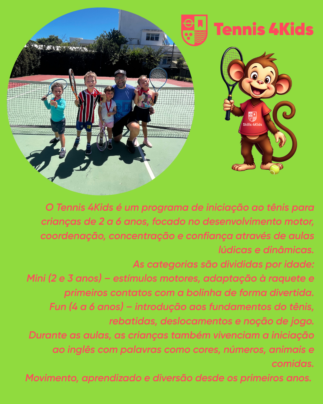 Atendemos crianças a partir de **2 anos** com aulas estruturadas de **futebol, tênis e jiu-jitsu**, respeitando cada fase do desenvolvimento. Trabalhamos coordenação motora, socialização e valores importantes de forma lúdica e segura.